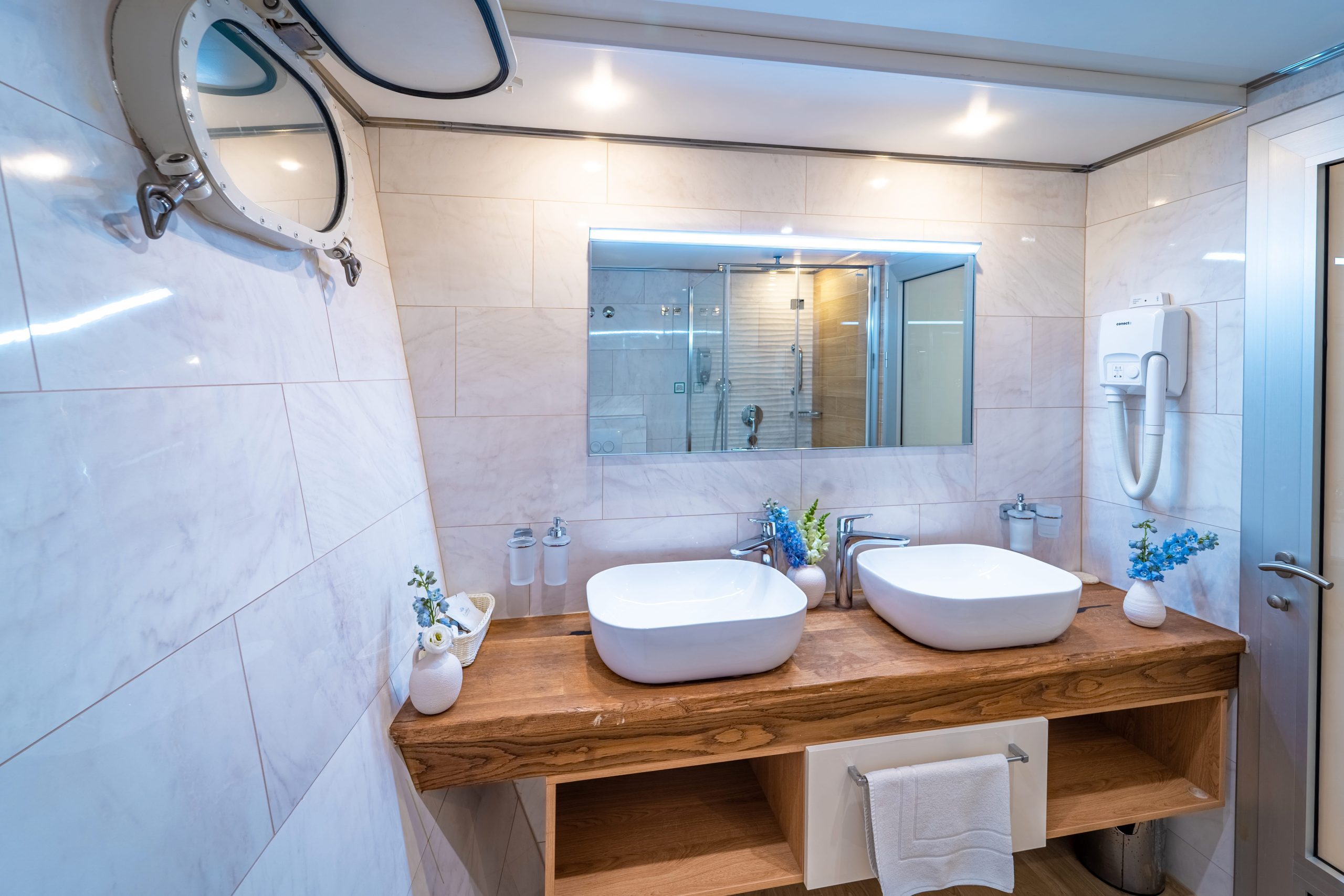 16 cabins. Up to 34 guests. Riva gives you the space to be together without giving up comfort or privacy. With 16 bright cabins across three decks, every guest has room to settle in, switch off, and sleep well. Private en suite bathrooms, quality materials, and smart features make every stay feel comfortable from day one.